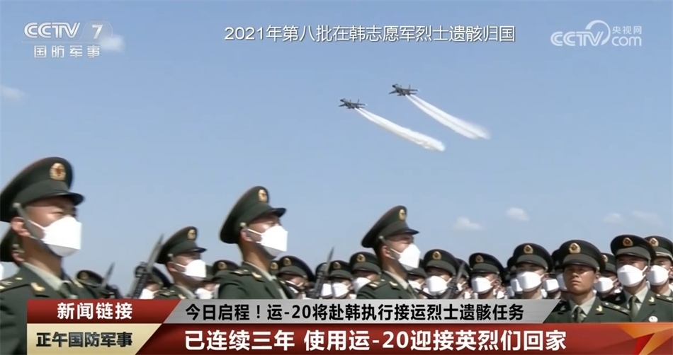今年是中國人民志愿軍抗美援朝出國作戰(zhàn)勝利70周年。在偉大的抗美援朝戰(zhàn)爭中,197000多名中國人民志愿軍光榮犧牲。黨和國家高度重視在韓志愿軍烈士遺骸歸國安葬工作,2014年以來,中韓雙方遵循人道主義精神,已成功交接913位在韓志愿軍烈士遺骸。今年也是按照中韓雙方達(dá)成共識的第十次交接。值得一提的是,十次交接,中國空軍都執(zhí)行為專機(jī)護(hù)航的任務(wù)。從2020年起,我國已經(jīng)連續(xù)三年使用運-20接迎英烈回家,今年是第四年。而從去年開始,更是“雙20”列陣長空,告慰英烈。
