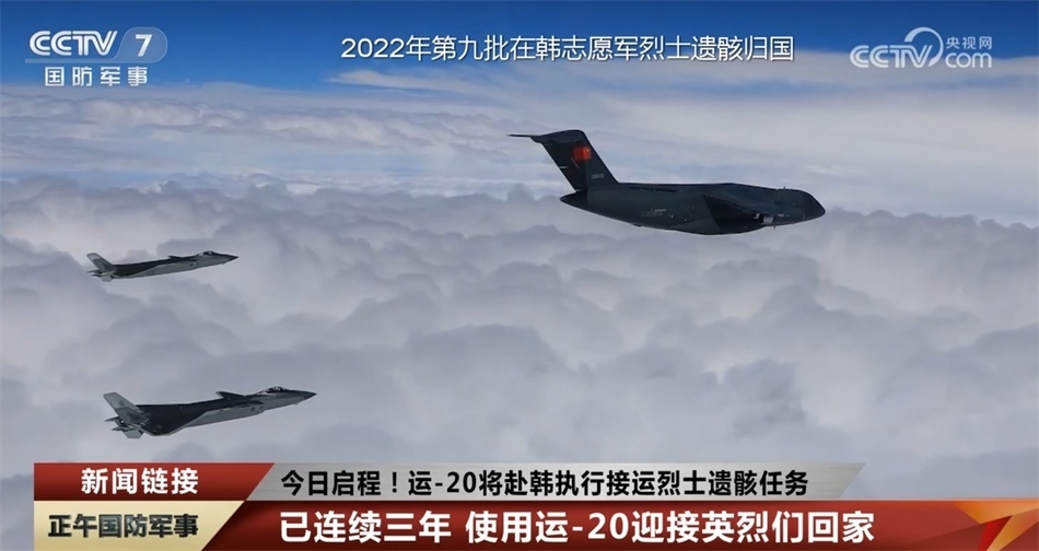 2022年9月16日,我國從韓國接回第九批88位在韓中國人民志愿軍烈士遺骸。當(dāng)運-20進(jìn)入我國領(lǐng)空后,兩架殲-20編隊護(hù)航,大國重器“雙20”列陣長空,告慰革命英烈。這是空軍首次以“雙20同框”的畫面接迎志愿軍烈士遺骸歸國。