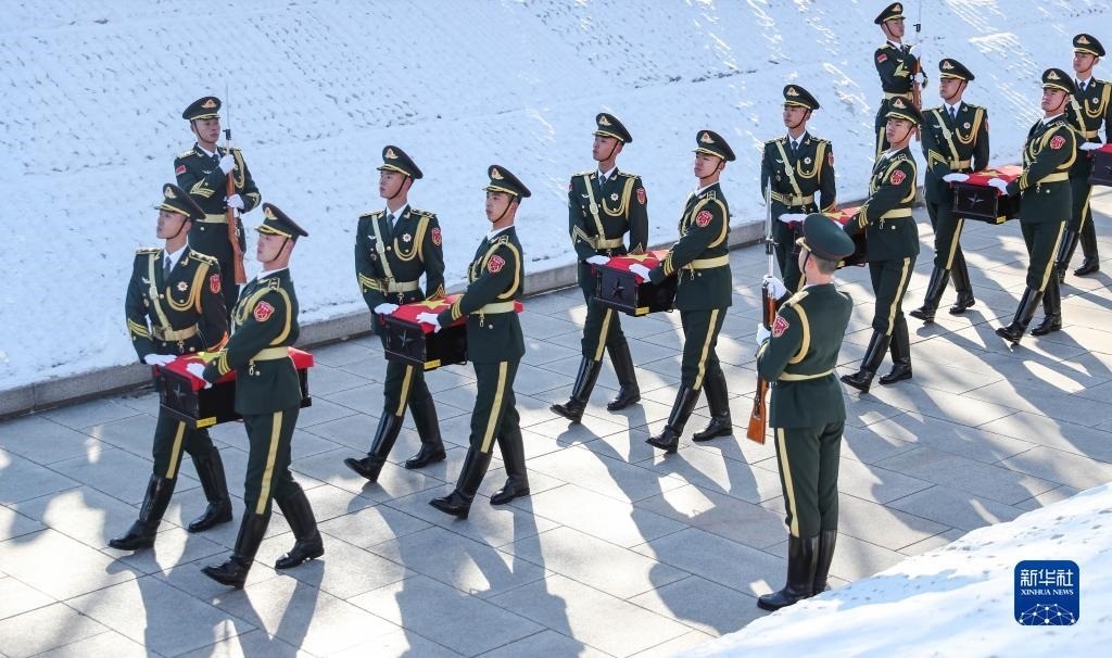 中國人民解放軍儀仗司禮大隊禮兵抬棺佇立,在甬道上等待進入陵園的下沉式志愿軍烈士紀念廣場。甬道一側,已經安葬在這里的志愿軍烈士墓冢新雪未消,披著素白。
