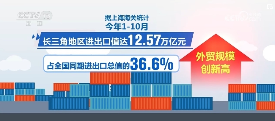 據(jù)上海海關(guān)統(tǒng)計(jì),2023年1—10月,長(zhǎng)三角地區(qū)進(jìn)出口值達(dá)12.57萬億元,占全國(guó)同期進(jìn)出口總值的36.6%,外貿(mào)規(guī)模創(chuàng)新高。