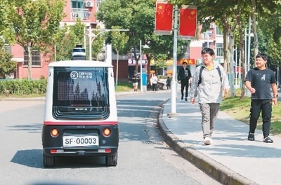 在浙江省金華職業(yè)技術(shù)學院的校園里,一輛無人快遞車在配送快遞。胡肖飛攝(人民圖片)