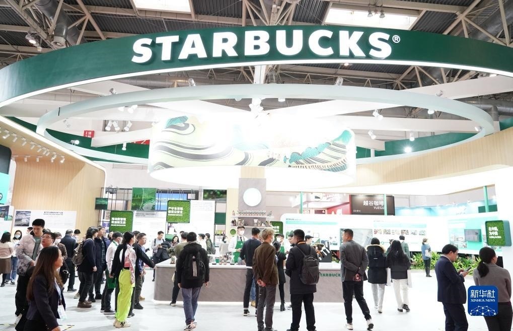 這是在首屆中國國際供應(yīng)鏈促進博覽會健康生活鏈展區(qū)拍攝的星巴克展位(2023年11月28日攝)。新華社記者 任超 攝