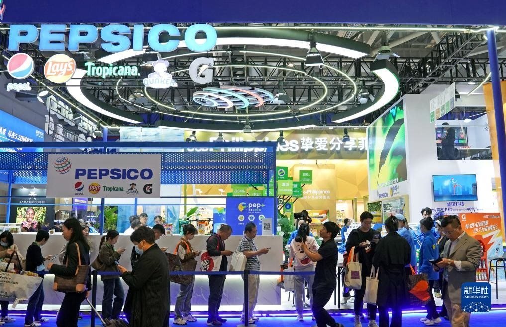 2023年11月8日在第六屆進博會食品及農(nóng)產(chǎn)品展區(qū)拍攝的百事公司展臺。今年是百事公司首次參展進博會。新華社記者 劉穎 攝