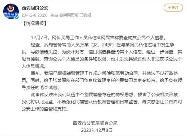 ·西安閻良公安通報警務輔助人員稱要查網(wǎng)友個人信息:解除勞動合同,予以行政處罰。