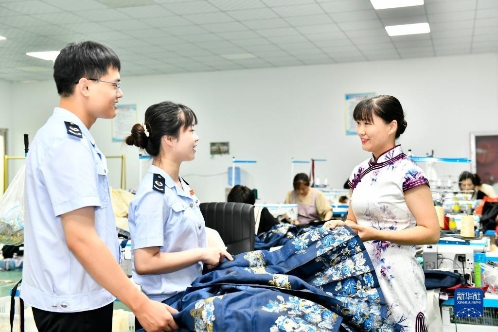 在山東曹縣辰霏服飾有限公司,曹縣稅務(wù)局的工作人員上門走訪,介紹減稅降費(fèi)助企發(fā)展相關(guān)優(yōu)惠政策(2023年7月6日攝)。新華社記者 郭緒雷 攝