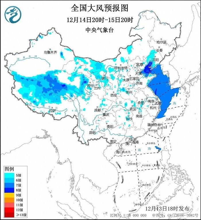 12月14日20時至15日20時,內(nèi)蒙古中西部、寧夏、西藏西部、青海東部和南部等地部分地區(qū)有5~6級、陣風(fēng)7~9級的大風(fēng);渤海、渤海海峽、黃海大部海域、東海西部海域?qū)⒂?~8級、陣風(fēng)9級的大風(fēng),其中渤海東北部的部分海域風(fēng)力可達(dá)9級、陣風(fēng)10級。