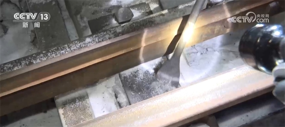 我在車站里看到不僅有給列車編組的司機(jī)、調(diào)度員,我還看到在鐵路的道岔還有很多工作人員正在做一些積雪清掃還有除冰的工作。我們可以湊近看一下,可以看到道岔這里現(xiàn)在是被凍住了,已經(jīng)沒法推動這個鐵軌,而這的空間又非常小,所以只能靠這樣的小鏟子一點點鏟,才能把這塊兒的積雪和冰給清干凈。