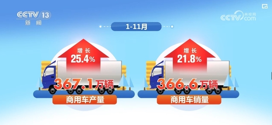 在1—11月份的數(shù)據(jù)中,商用車產(chǎn)銷量分別完成367.1萬輛和366.6萬輛,同比也實現(xiàn)了兩位數(shù)增長,分別增長25.4%和21.8%。