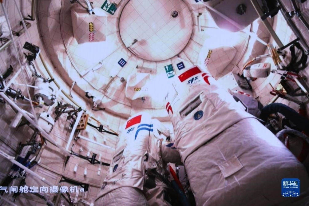 12月21日在北京航天飛行控制中心拍攝的神舟十七號(hào)航天員湯洪波(右)、唐勝杰開展艙外操作的畫面。新華社發(fā)(韓啟揚(yáng)攝)