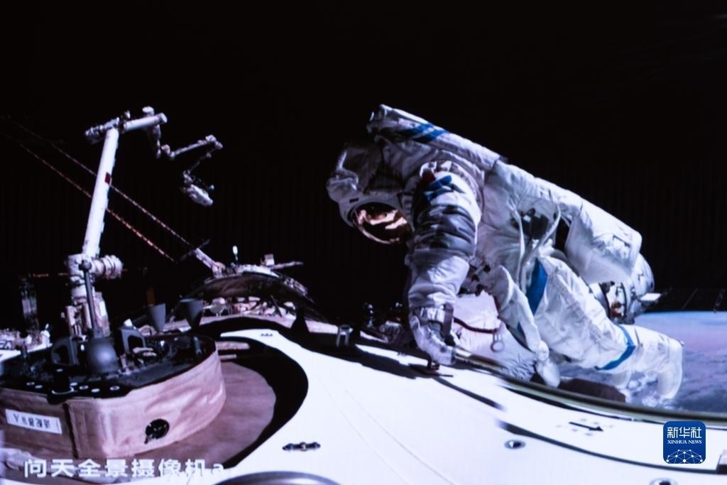12月21日在北京航天飛行控制中心拍攝的神舟十七號(hào)航天員江新林協(xié)同兩名艙外航天員實(shí)施出艙活動(dòng)的畫面。新華社記者 李杰 攝