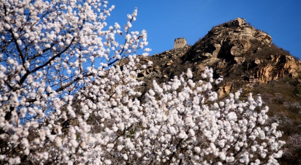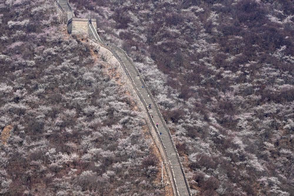 游客在山花遍野的慕田峪長城景區(qū)參觀游覽(2023年3月29日攝)。