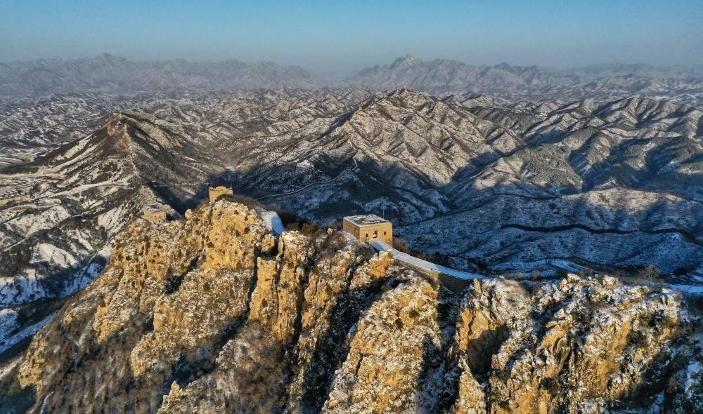 在晨曦中拍攝的雪后司馬臺長城(無人機照片,2023年2月19日攝)。