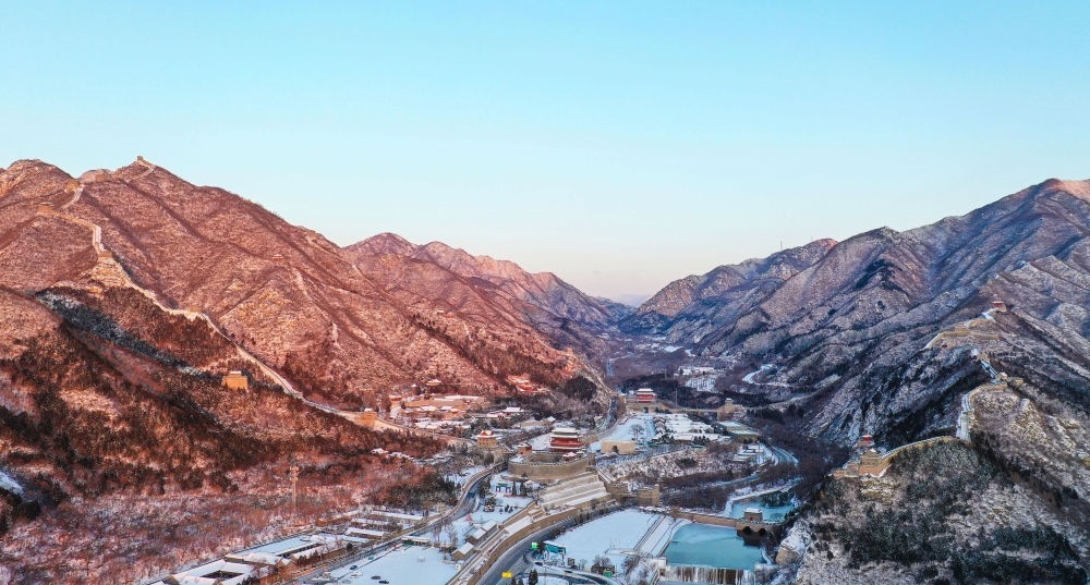 朝陽灑在雪后的居庸關(guān)長城上(無人機照片,2023年12月16日攝)。