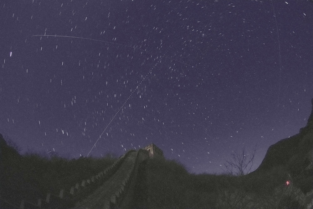 在北京延慶水關(guān)長城拍攝的中國空間站過境照片(從左下向右上的軌跡為中國空間站,軌跡為多張照片堆棧,2021年12月12日攝)。
