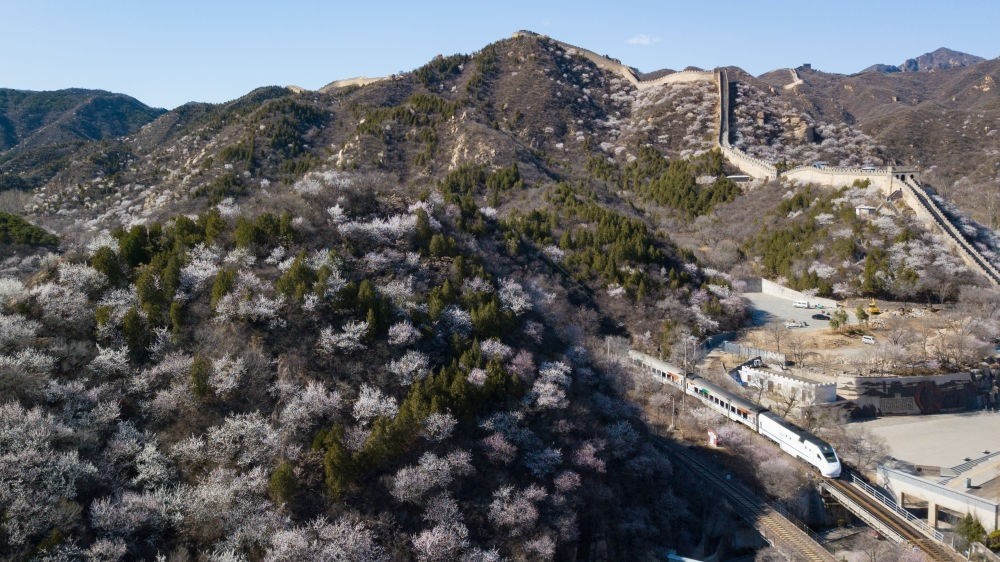 一列火車在北京水關(guān)長城附近的山花中穿行(無人機照片,2020年3月27日攝)。