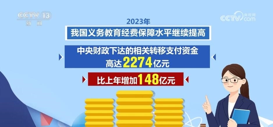 2023年,我國(guó)義務(wù)教育經(jīng)費(fèi)保障水平繼續(xù)提高,中央財(cái)政下達(dá)的相關(guān)轉(zhuǎn)移支付資金高達(dá)2274億元,比上年增加148億元。2023年,一系列義務(wù)教育重大工程項(xiàng)目繼續(xù)實(shí)施,讓中小學(xué)辦學(xué)條件不斷優(yōu)化。其中,義務(wù)教育薄弱環(huán)節(jié)改善與能力提升項(xiàng)目中央安排330億元,支持各地義務(wù)教育學(xué)校標(biāo)準(zhǔn)化建設(shè)。