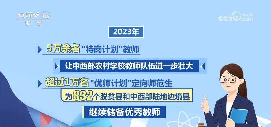 強(qiáng)教必先強(qiáng)師。2023年,5萬(wàn)余名“特崗計(jì)劃”教師讓中西部農(nóng)村學(xué)校教師隊(duì)伍進(jìn)一步壯大,超過(guò)1萬(wàn)名“優(yōu)師計(jì)劃”定向師范生為832個(gè)脫貧縣和中西部陸地邊境縣繼續(xù)儲(chǔ)備優(yōu)秀教師。