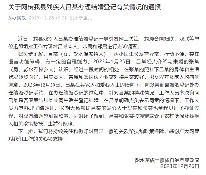 ·重慶彭水通報“23歲疑似智力障礙女子與五旬男子結婚”。