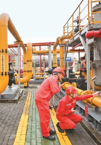 在位于重慶涪陵的中國首個(gè)投入商業(yè)開發(fā)頁巖氣田——涪陵頁巖氣田白濤集輸站,技術(shù)人員對設(shè)備進(jìn)行巡檢。新華社記者 王全超攝