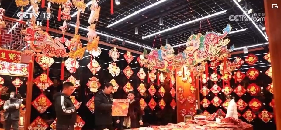 在浙江義烏國際商貿(mào)城,來自全國各地的采購商們抓緊選購著年貨。市場里的龍元素產(chǎn)品頗受客商們歡迎,對聯(lián)、年畫、福字、紅包等產(chǎn)品,將從浙江義烏發(fā)往全球各地。