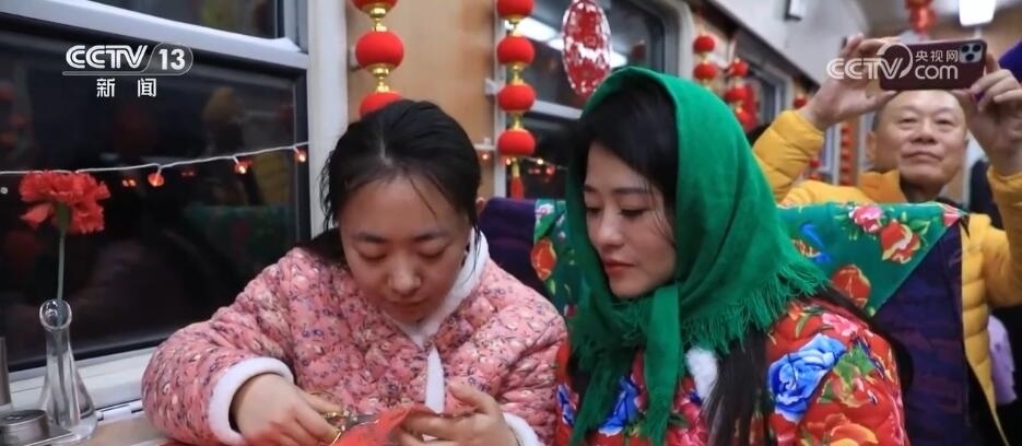 總臺(tái)央視記者 楊曜語:一上車,我就被濃濃的東北文化所感染到了,整個(gè)車廂都被東北大花的經(jīng)典配色裝飾著,再加上隨手就能品嘗到的特色美食,坐在床鋪上就感覺一秒鐘“穿越”到農(nóng)家炕頭。跟著游客,我現(xiàn)在到了一節(jié)互動(dòng)車廂,這里被布置成“跨年狂歡”的主題場(chǎng)景,在這里游客可以參與剪窗花、包餃子、穿東北大花襖一系列特色活動(dòng),現(xiàn)在就有很多游客在這里打卡拍照。
