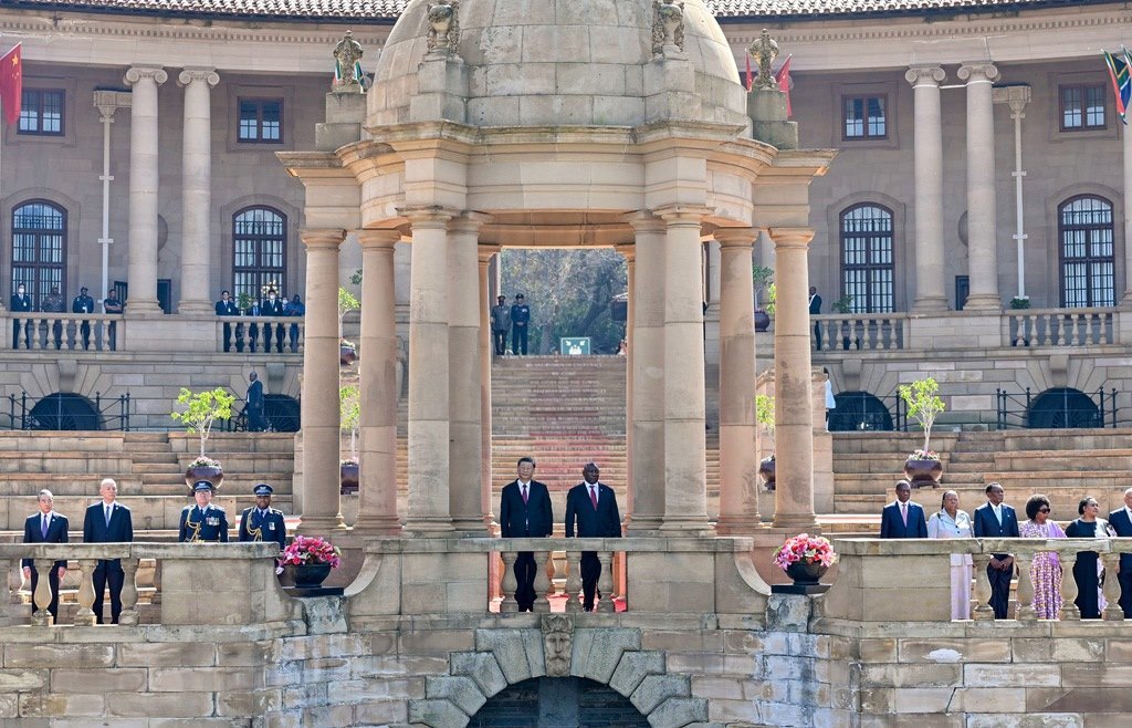 當?shù)貢r間2023年8月22日上午,正在南非進行國事訪問的國家主席習近平在比勒陀利亞總統(tǒng)府同南非總統(tǒng)拉馬福薩會談。會談前,拉馬福薩在總統(tǒng)府廣場為習近平舉行歡迎儀式。