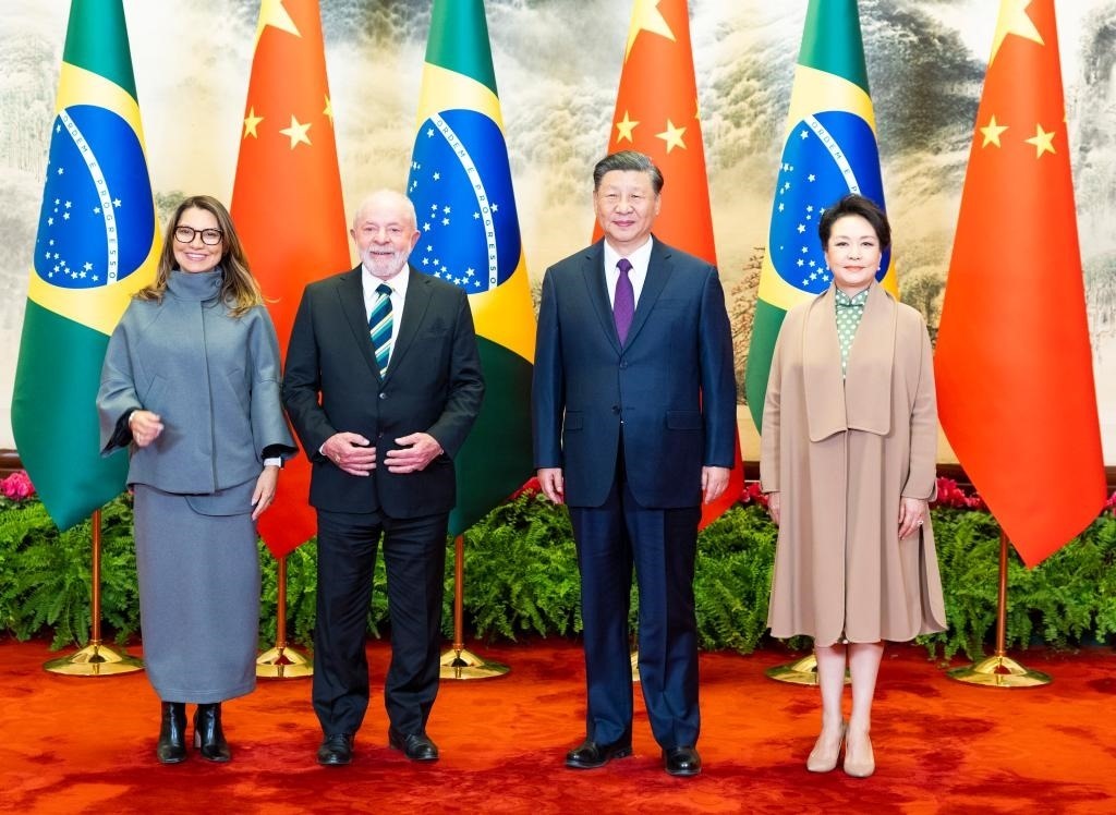 2023年4月14日下午,國家主席習近平在北京人民大會堂同來華進行國事訪問的巴西總統(tǒng)盧拉舉行會談。這是會談前,習近平和夫人彭麗媛同盧拉和夫人羅桑熱拉合影。