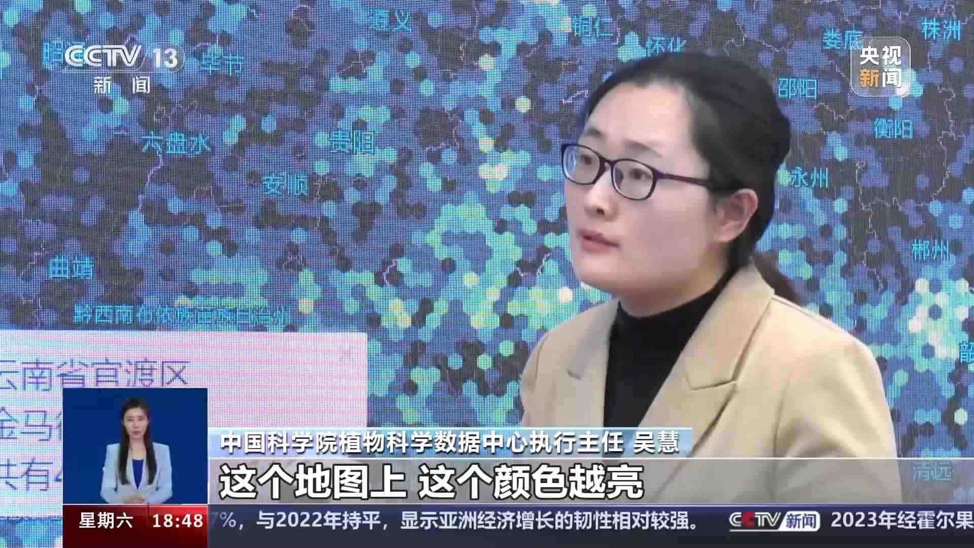 中國科學(xué)院植物科學(xué)數(shù)據(jù)中心執(zhí)行主任 吳慧:這個(gè)地圖上,這個(gè)顏色越亮,代表這個(gè)區(qū)域分布的我們的重點(diǎn)野生植物越多。
