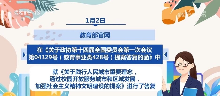 1月2日,教育部官網(wǎng)在《關(guān)于政協(xié)第十四屆全國委員會(huì)第一次會(huì)議第04329號(教育事業(yè)類428號)提案答復(fù)的函》中,就《關(guān)于踐行人民城市重要理念,通過校園開放服務(wù)城市和區(qū)域發(fā)展,加強(qiáng)社會(huì)主義精神文明建設(shè)的提案》進(jìn)行了答復(fù)。