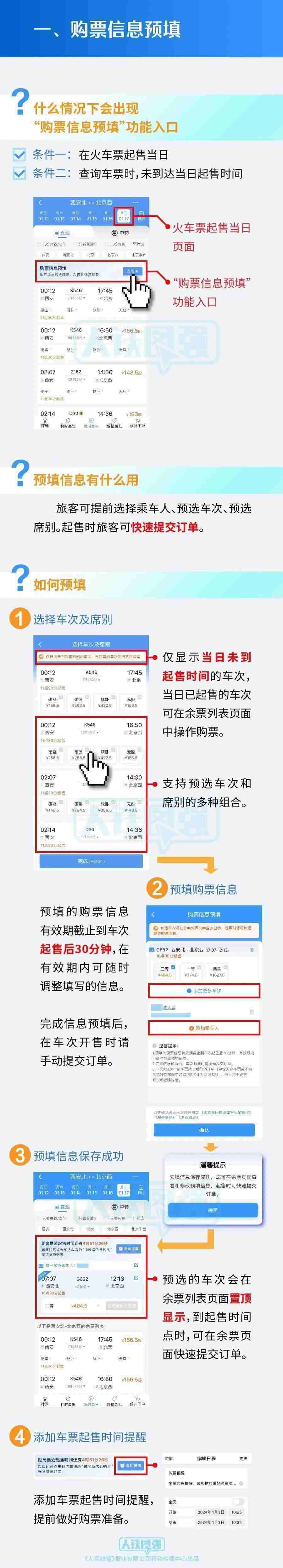 旅客朋友可于車票起售當(dāng)日,預(yù)先填寫乘車人、車次、席別等信息,在車票開始發(fā)售時(shí)一鍵提交訂單并完成支付,使旅客購票更便捷。