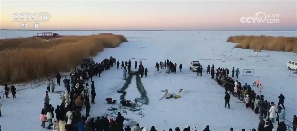 總臺記者? 阮超:我現(xiàn)在是烏梁素海的冰面上,我身邊就是此次冬捕的出魚口。隨著漁網(wǎng)緩緩拉動,水面下的魚被不斷運(yùn)送到冰面上來。