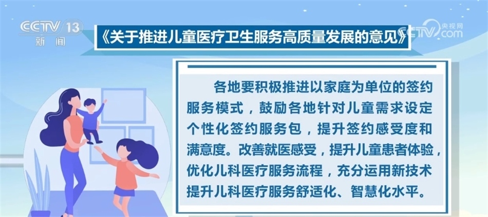 《意見》要求,各地要積極推進以家庭為單位的簽約服務模式,鼓勵各地針對兒童需求設定個性化簽約服務包,提升簽約感受度和滿意度。改善就醫(yī)感受,提升兒童患者體驗,優(yōu)化兒科醫(yī)療服務流程,充分運用新技術提升兒科醫(yī)療服務舒適化、智慧化水平。