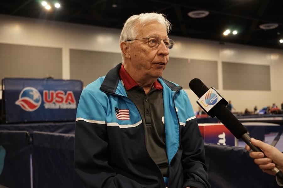 2023年12月16日,中美“乒乓外交”親歷者戴爾·斯威里斯在2023年美國(guó)乒乓球公開(kāi)賽老年組比賽間隙接受新華社記者專(zhuān)訪。