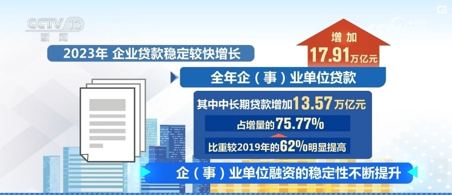 2023年,企業(yè)貸款穩(wěn)定較快增長(zhǎng)。全年企(事)業(yè)單位貸款增加17.91萬(wàn)億元,其中,中長(zhǎng)期貸款增加13.57萬(wàn)億元,占增量的75.77%,比重較2019年的62%明顯提高,企(事)業(yè)單位融資的穩(wěn)定性不斷提升。