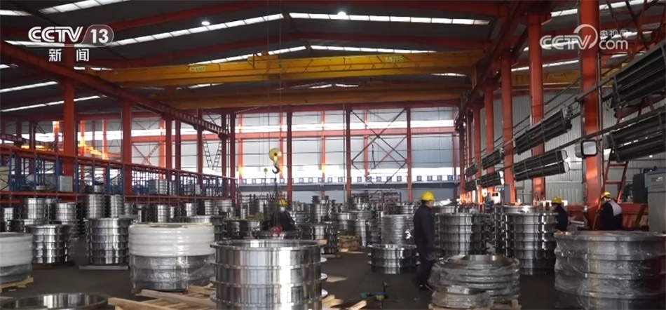 總臺央視記者 古峻嶺:這個大家伙叫輪轂,就是風機葉輪中間這個位置,就是它把重達百噸的3支葉片牢牢固定在風機之上。采用傳統(tǒng)人工的方式,需要2個人花上180分鐘才能安裝完,現(xiàn)在只需要80分鐘即可完成。傳統(tǒng)定點裝配模式一天只能裝配3—4臺主機,而在現(xiàn)在的流水線上作業(yè),一天則可以裝配6—8臺主機,效率翻倍,但是用工卻減少了一半。