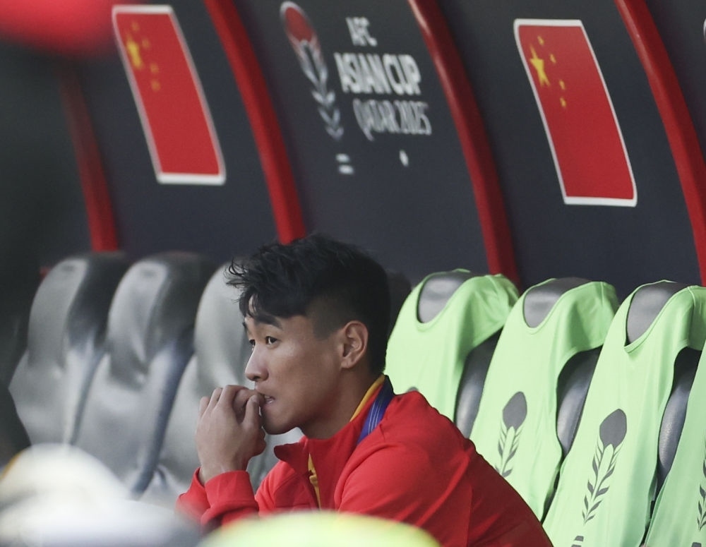 1月13日,中國隊對陣塔吉克斯坦隊,圖為因傷未能進(jìn)入名單的韋世豪賽前在替補席上。新華社記者 曹燦 攝