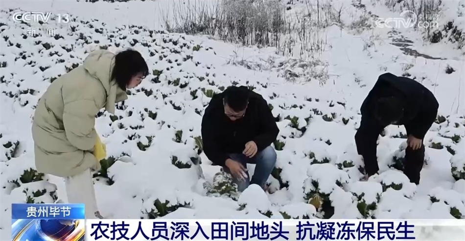 在貴州畢節(jié)螺絲村蔬菜基地,田間地頭白茫茫一片。為應(yīng)對(duì)低溫凝凍天氣,當(dāng)?shù)剞r(nóng)技人員現(xiàn)場(chǎng)查看蔬菜長(zhǎng)勢(shì),為農(nóng)戶講解蔬菜防凍知識(shí),指導(dǎo)做好防寒抗凍措施。