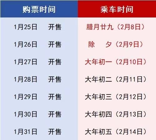 1月26日,2024年2月9日的除夕火車票將正式發(fā)售。2024年春運(yùn)自1月26日開(kāi)始至3月5日結(jié)束,共40天。2024年春節(jié)假期從2月10日(初一)至2月17日(正月初八),共8天。根據(jù)目前鐵路客票提前15天預(yù)售的規(guī)則類推,1月27日開(kāi)售2月10日(大年初一)火車票;2月3日開(kāi)售2月17日(正月初八)火車票。
