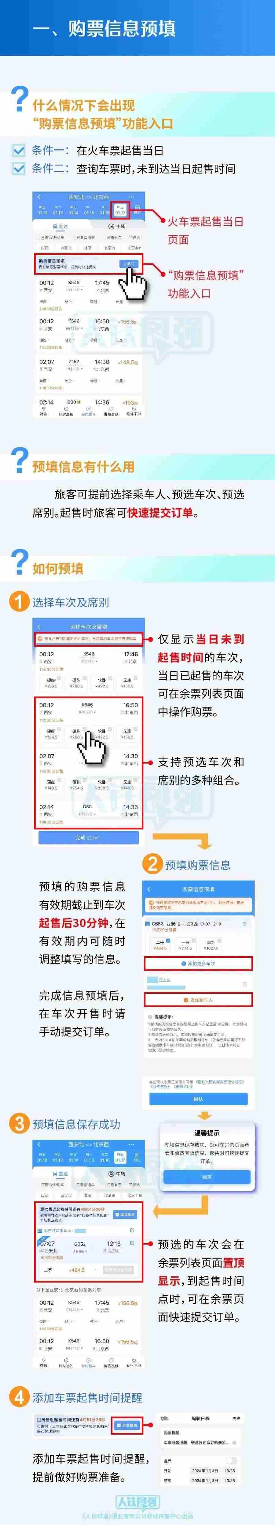 對(duì)于網(wǎng)購(gòu)火車票(12306手機(jī)App購(gòu)票)的旅客,鐵路部門(mén)提醒,首先,注意起售時(shí)間。不同火車站車票網(wǎng)上起售時(shí)間并不相同,旅客需根據(jù)自己購(gòu)票的車站查詢購(gòu)票具體時(shí)間,提前做好準(zhǔn)備,以免錯(cuò)過(guò)第一時(shí)間購(gòu)票。旅客可以打開(kāi)12306官網(wǎng),點(diǎn)擊“信息查詢”欄目下的“起售時(shí)間”,再選擇起售日期和起售車站進(jìn)行查詢。其次,做好支付準(zhǔn)備。網(wǎng)購(gòu)車票時(shí)須在30分鐘內(nèi)完成支付,超時(shí)未支付的,車票將自動(dòng)取消。