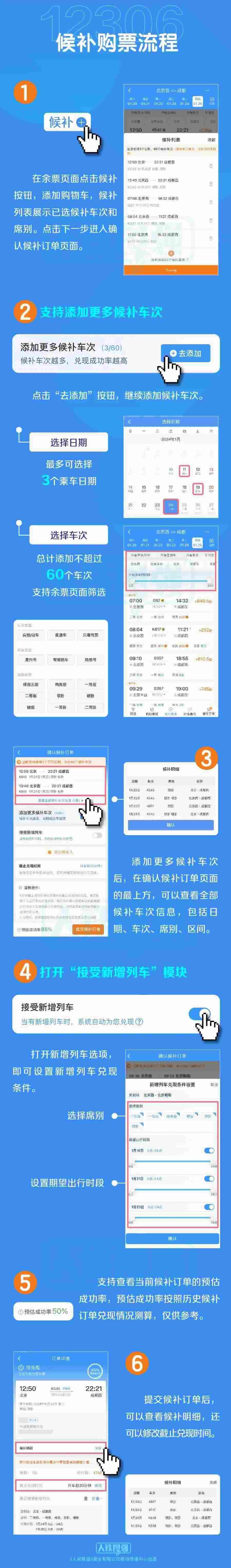 四是臨時(shí)新增旅客列車席位優(yōu)先配售給已提交候補(bǔ)訂單的旅客。旅客在提交候補(bǔ)訂單時(shí),可選擇接受購(gòu)買(mǎi)符合出行需求的新增旅客列車車票,如鐵路部門(mén)臨時(shí)新增旅客列車,在車票起售時(shí),鐵路12306將自動(dòng)優(yōu)先配售給已提交候補(bǔ)訂單的旅客,旅客無(wú)需人工查詢?cè)鲩_(kāi)列車信息再購(gòu)票。