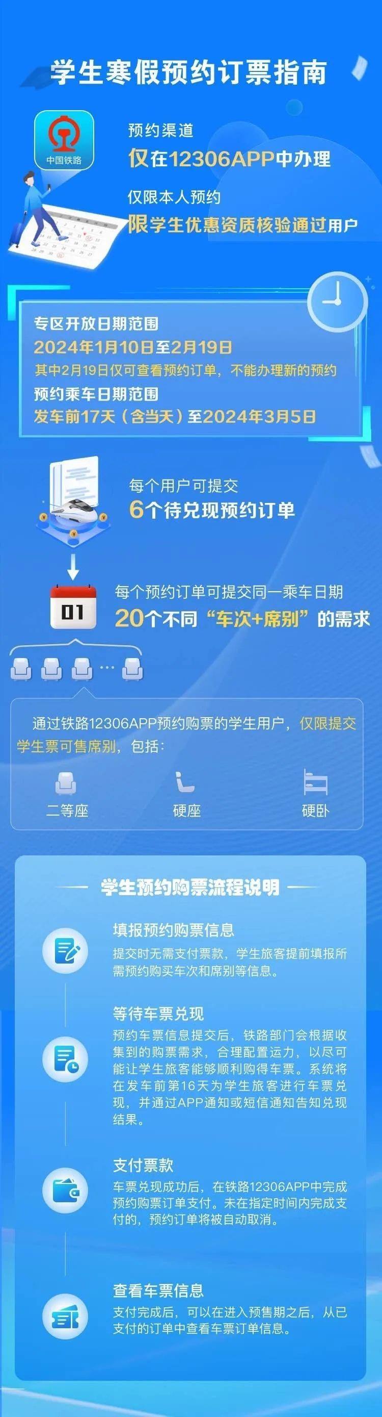 學(xué)生、務(wù)工人員通過(guò)鐵路12306專區(qū)購(gòu)買(mǎi)春運(yùn)期間火車票,可提交開(kāi)車前17天(含)以上的出行購(gòu)票需求,最晚可預(yù)約3月5日的車票。符合條件的旅客朋友可在開(kāi)車前17天23時(shí)前在12306手機(jī)客戶端提交購(gòu)票需求,在開(kāi)車前16天查詢兌現(xiàn)結(jié)果,須在開(kāi)車前第16天23時(shí)前,通過(guò)12306手機(jī)客戶端預(yù)約專區(qū)支付票款,逾期未支付的,訂單自動(dòng)取消;兌現(xiàn)成功后逾期未支付達(dá)到5次的,不再提供預(yù)約購(gòu)票服務(wù)。