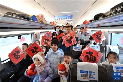 1月26日,在由南京南站發(fā)往太倉的G8981次列車上,南京客運段的工作人員與收到“?!弊值穆每秃嫌啊P氯A社記者 柳文惠 攝