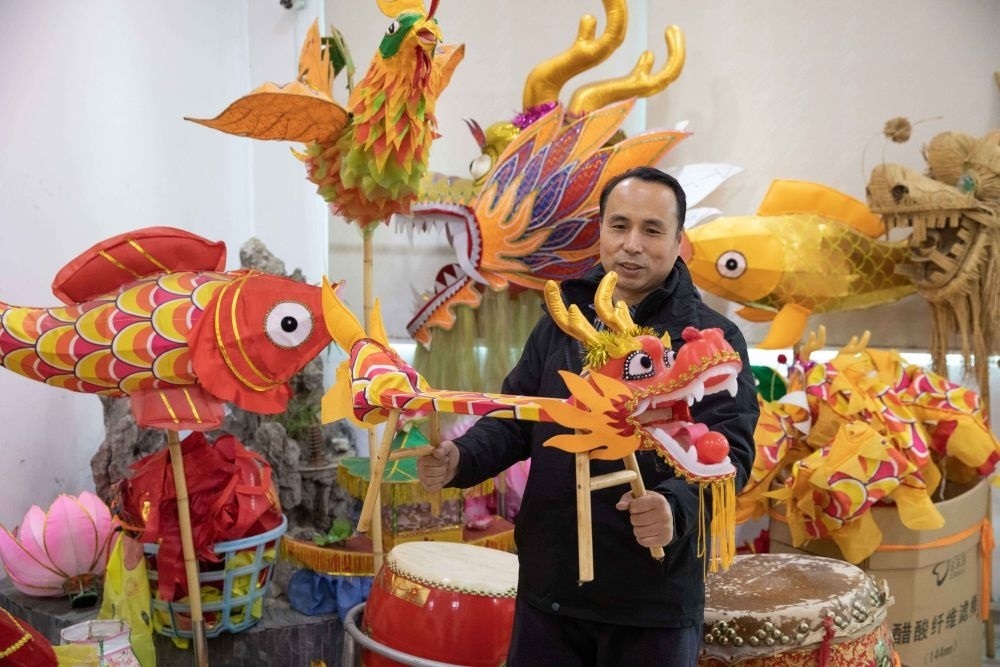 1月30日,南昌市青云譜區(qū)城南龍燈工廠,城南龍燈傳承人史克濱展示為兒童設(shè)計(jì)生產(chǎn)的小板凳龍。新華社發(fā)(孫睿澤 攝)