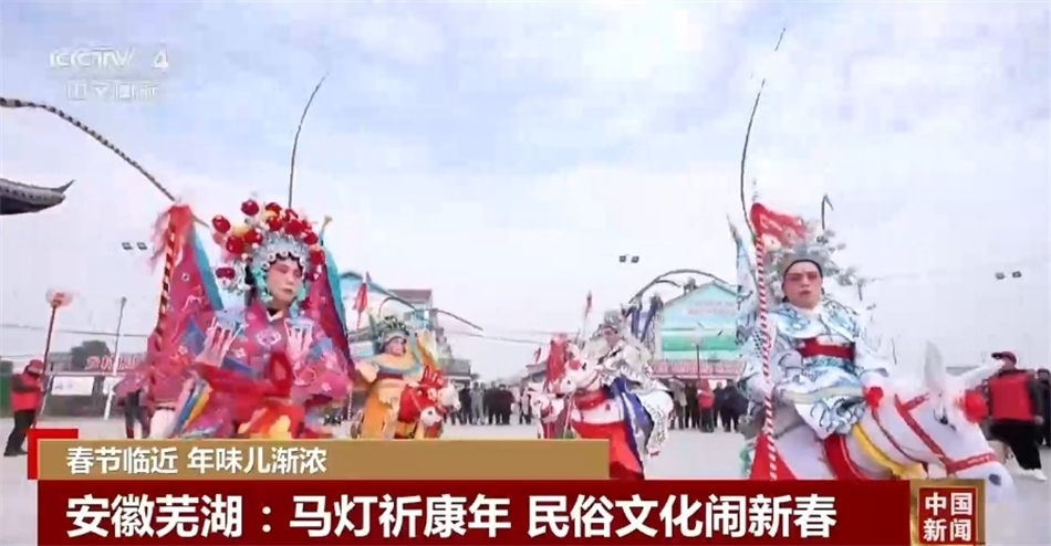 在安徽蕪湖花橋鎮(zhèn)咸定村,70多人組成的馬燈隊伍正在進(jìn)行精彩的表演。村民們身著戲裝,一手提馬首,一手揚馬鞭,不斷變換陣式,引得人們連連叫好。