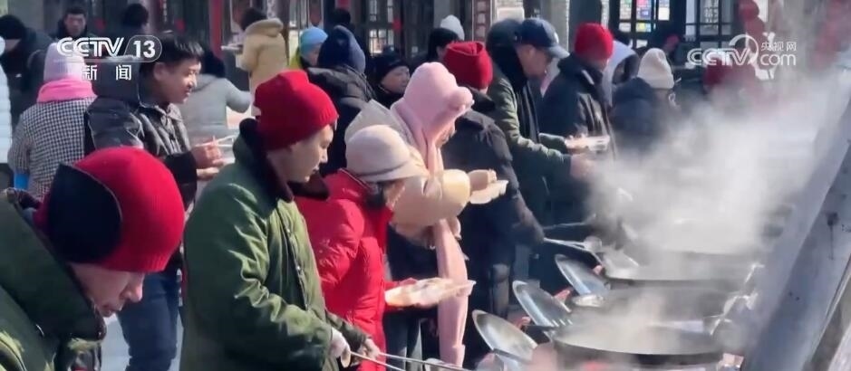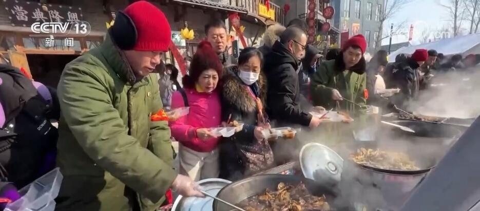 總臺(tái)記者 王亞平:我現(xiàn)在就是在長(zhǎng)春市蓮花島年貨大集。這會(huì)兒大集上香氣撲鼻,每口鐵鍋前都圍滿了品嘗美味的人們。室外冒著寒氣,食客嘴里吐著哈氣,用東北話講,吃得“嘎嘎香”。