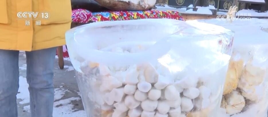 不僅是商品非常有特色,大家來(lái)看,這個(gè)裝粘豆包的大缸非常結(jié)實(shí),晶瑩剔透。它是用水桶為模具,內(nèi)部裝水,在室外凍上一個(gè)晚上,脫模后就成了一個(gè)天然冰箱,在鄉(xiāng)村,各家年貨、凍貨都可以儲(chǔ)存在這里,整個(gè)冬天都沒(méi)有問(wèn)題,既保鮮又節(jié)約空間。大集上,還有對(duì)聯(lián)、福字、鄉(xiāng)村土特產(chǎn),充滿濃濃的鄉(xiāng)土氣息。