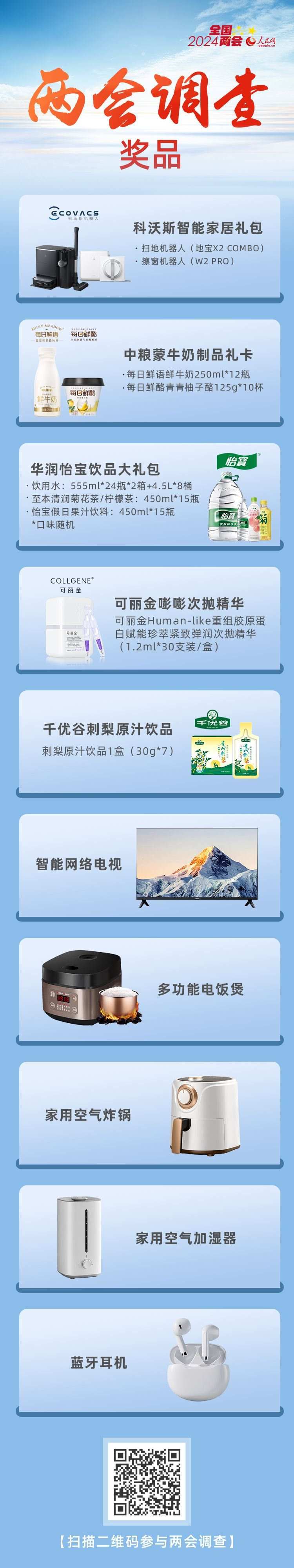 為感謝網(wǎng)友對全國兩會調(diào)查的支持,參與人民網(wǎng)2024年全國兩會調(diào)查還有機會抽取精美獎品。
