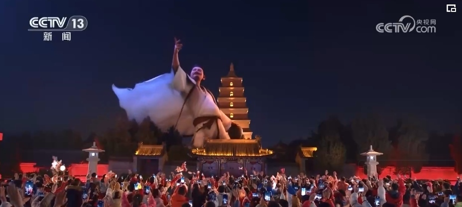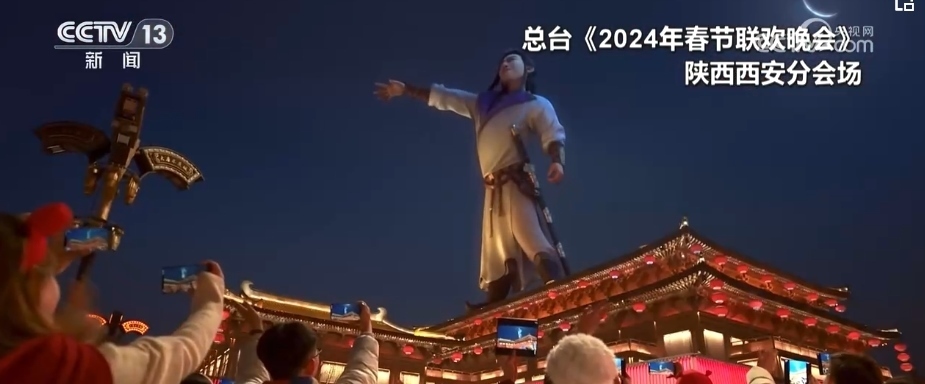 除夕當(dāng)晚9時(shí),西安分會(huì)場(chǎng)《山河詩(shī)長(zhǎng)安》篇章的“打開方式”讓人眼前一亮。在科技助力下,“詩(shī)仙”李白跨越歲月長(zhǎng)河“穿越”而來(lái),在煙火璀璨中,隨著熙熙攘攘的人群一起走進(jìn)西安城墻永寧門,走入千年后的耀眼長(zhǎng)安。