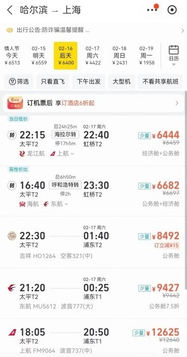 另外,如果條件允許,錯峰返程也是個好辦法。例如,從哈爾濱到北京,17日機(jī)票最低需要6000多元,但如果選擇19日回,機(jī)票價格降到1500元左右,直接省下4000多元。同樣的情況也發(fā)生在哈爾濱到上海、三亞到重慶等航線上。