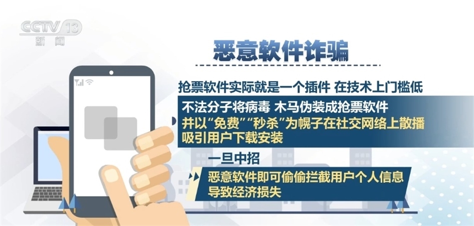 惡意軟件詐騙:搶票軟件實(shí)際就是一個(gè)插件,在技術(shù)上門檻低,不法分子將病毒、木馬偽裝成搶票軟件,并以“免費(fèi)”“秒殺”為幌子在社交網(wǎng)絡(luò)上散播,吸引用戶下載安裝。一旦中招,惡意軟件即可偷偷攔截用戶個(gè)人信息,導(dǎo)致經(jīng)濟(jì)損失。